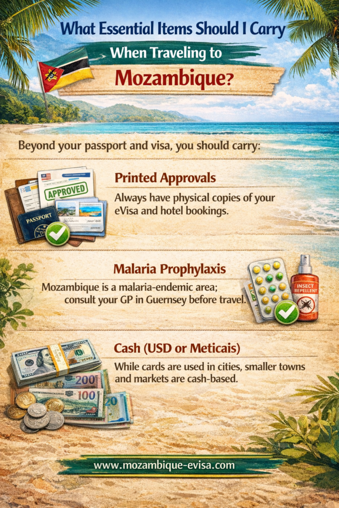 Upon arrival at a Mozambican airport or land border, you must present your passport and your printed eVisa preliminary approval. Immigration officers will scan your fingerprints and take a photo. You may also be asked to show proof of a return flight and sufficient funds. Always ensure your passport is stamped upon entry to avoid issues when you depart.